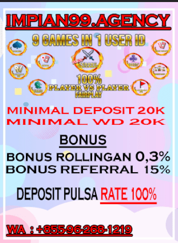 Impian99 hadir sebagai situs sakong online dengan memberikan layanan yang terbaik dan profesional sebagai agen judi yang sudah memiliki ribuan member dan memilki kredibilitas yang sudah sangat terpercaya Impian99 Menjamin semua kemenangan membernya pasti di bayar 100% Setiap proses layanan di situs Impian99 akan di laksanakan dengan cepat baik saat anda mengisi Deposit maupun pada saat anda ingin menarik dana atau Withdraw. Karena situs Impian99 juga di dukung dengan layanan Bank Lokal terbesar seperti Bank BCA Bank Mandiri Bank BNI Bank BRI Danamon CIMB dll akan mempermudah setiap proses transaksi dengan aman. Layanan terbaik ini akan senantiasa di persembahkan untuk anda semua baik member lama maupun yang baru mendaftar di situs Sakong online terpercaya Impian99